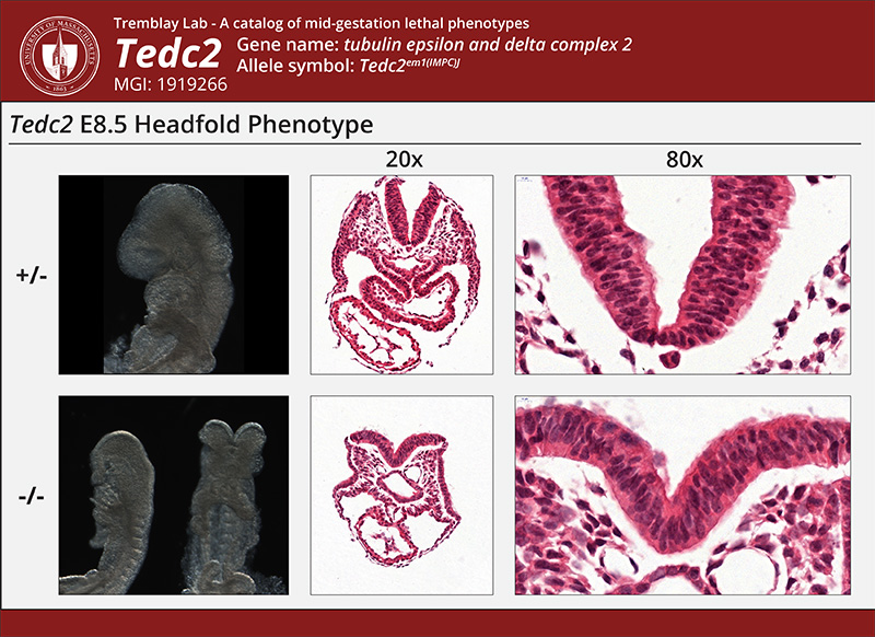 | Caption | E8.5 Tedc2em1(IMPC)J/Tedc2em1(IMPC)J (Tedc2-/-) headfold phenotype. Many Tedc2-/- embryos examined display a notochord that is present in some H&E stained sections but absent in others. | ||||