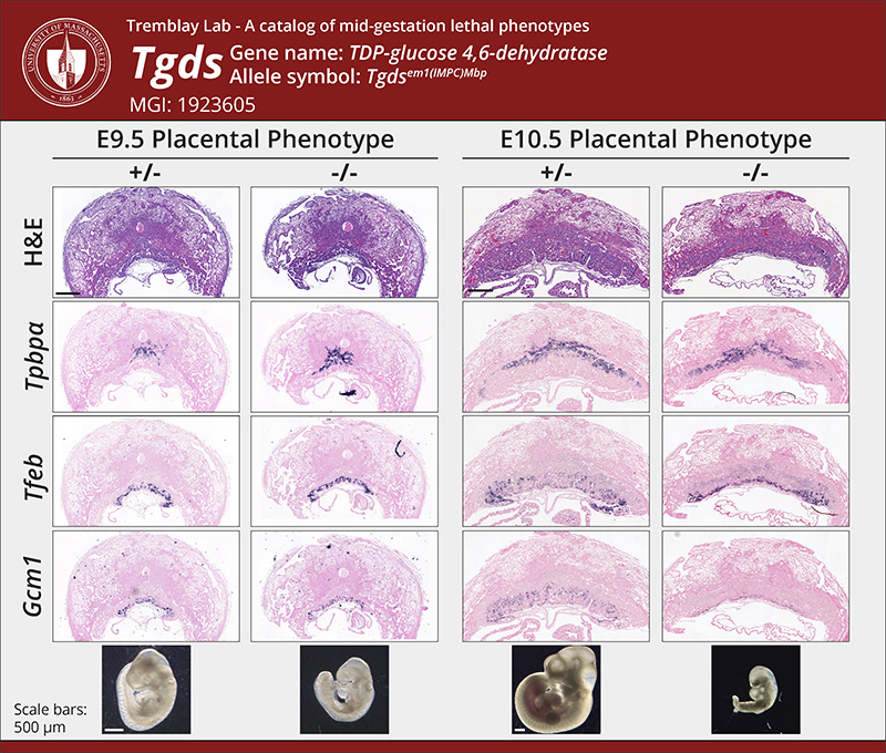 | Caption | Placental phenotype of Tgdsem1(IMPC)Mbp/Tgdsem1(IMPC)Mbp (Tgds-/-) embryos. At E9.5, Tgds-/- placentas are properly developed and comparable to controls. While Tpbpa staining appears more intense in the displayed KO placenta compared to the control littermate, it is not consistent with all KO and control placentas examined. At E10.5, Tgds-/- placentas exhibit an abnormal chorioallantoic interface (reduction in allantoic mesoderm) and multiple labyrinth zone defects compared to controls. In KO placentas, the Tfeb+ labyrinth trophoblast layer is reduced. Chorioallantoic branching is nearly absent as Gcm1 expression is sparse and remains at the chorioallantoic interface. | ||||