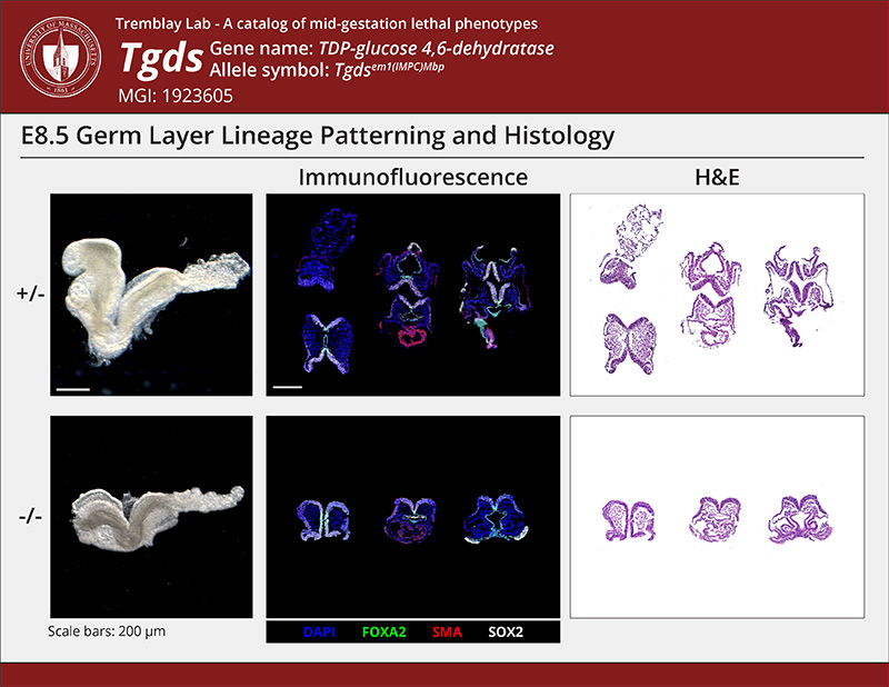 | Caption | E8.5 Tgdsem1(IMPC)Mbp/Tgdsem1(IMPC)Mbp (Tgds-/-) embryos have all 3 germ layers that appear appropriately patterned. | ||||
