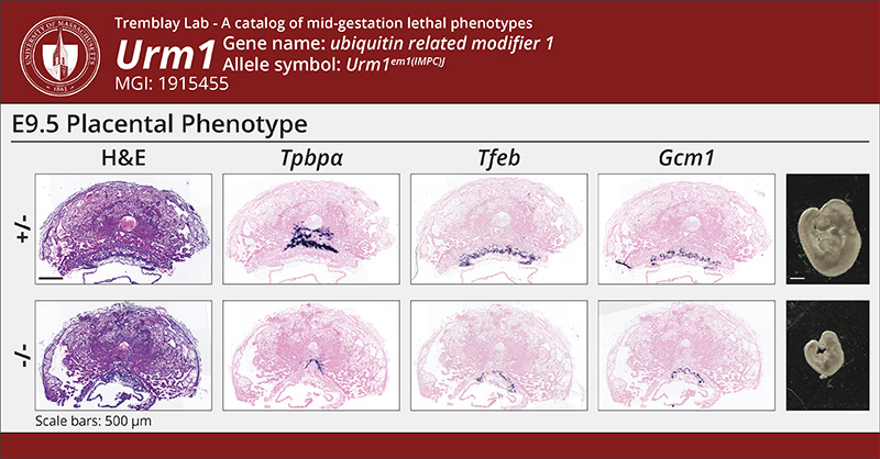 | Caption | Placental phenotypes in Urm1em1(IMPC)J/Urm1em1(IMPC)J (Urm1-/-) embryos. At E9.5, Urm1-/- placentas exhibit a diminished Tpbpa+ spongiotrophoblast layer, abnormal chorioallantoic interface (reduction in allantoic mesoderm and limited interface expansion), and multiple labyrinth zone defects in the KO compared to controls. The Tfeb+ region fails to expand, remaining a thin layer, and Gcm1+ chorioallantoic branching is severely impaired. | ||||
