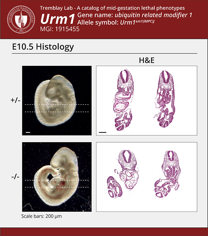 | Caption | Despite the delays observed throughout the development of Urm1em1(IMPC)J/Urm1em1(IMPC)J (Urm1-/-) embryos, some mutants recovered at E10.5 can exhibit surprisingly normal histological morphology. This mutant embryo has abnormal blood deposits as observed in whole mount as well as an abnormal forebrain and slight neural tube kink. This mutant is paired with a phenotypically normal heterozygous littermate that is only slightly older but also delayed compared with the remainder of the 10.5 litter. | ||||