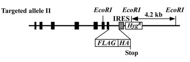| Caption | Generation of Trip12tm2Jyan (mt#2) ES cells. (A) Schematic representation of the Trip12 gene targeting construct (Targeted allele II). Solid rectangles represent the exons of the Trip12 gene. | ||||