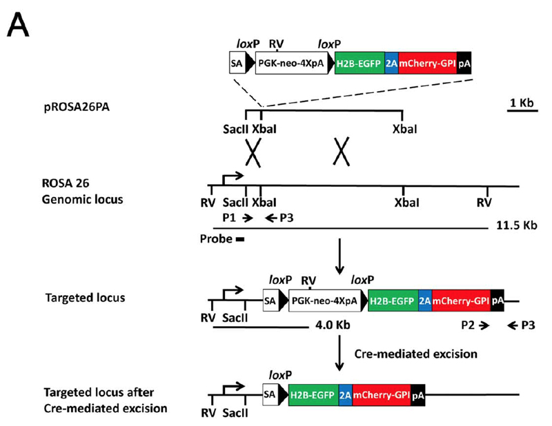 | Caption | Generation of the Gt(ROSA)26Sortm1Ytchn (R26R-GR) alleles. (A) Gene targeting strategy for the Cre activable R26R-GR reporter allele. The gene targeting vector contains a loxP flanked stop cassette, which can be excised by Cre-recombination, which results in expression of EGFP and mCherry in the nucleus and membrane, respectively. | ||||