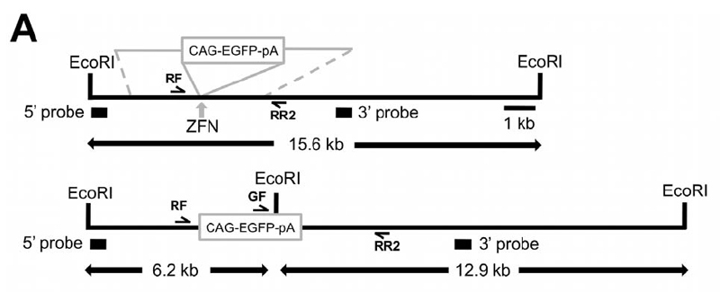 | Caption | Zinc finger nuclease pair 204/205 promotes ROSA26 targeting by homologous recombination in mouse zygotes. (A) Homologous recombination targeting strategy for the insertion of the targeting vector gtR26_EGFP carrying EGFP driven by a CAG promoter into the ROSA26 locus, to generate Gt(ROSA)26Sorem1(CAG-EGFP)Ltku. | ||||