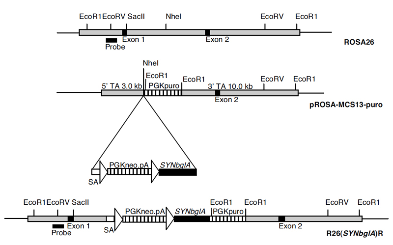 | Caption | Schematic of gene targeting at the ROSA26 locus to generate the Gt(ROSA)26Sortm2(EIF1AX-bglA*)Dwi (R26(SYNbglA)R) allele. Shown are: the ROSA26 locus (top); the targeting construct containing the loxP-PGKneo-loxP SYNbglA cassette (mid), arrows represent loxP sites; the targeted locus (bottom). Targeted clones were confirmed by Southern blotting of EcoR1 digested genomic DNA with the probe shown to generate 15 kb and 8.4 kb bands from the wild type and targeted alleles, respectively. | ||||