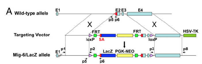 | Caption | Generation of the Errfi1tm2Gvw allele. (A) The strategy for constructing the targeting vector to generate the Errfi1tm2Gvw reporter allele. | ||||