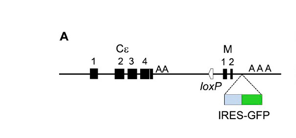 | Caption | Generation of the Ighetm1Mcdl (CepsilonGFP) allele. A) Schematic representation of CepsilonGFP Knock-In integration into the IgH Cepsilon (Ighe) locus. | ||||