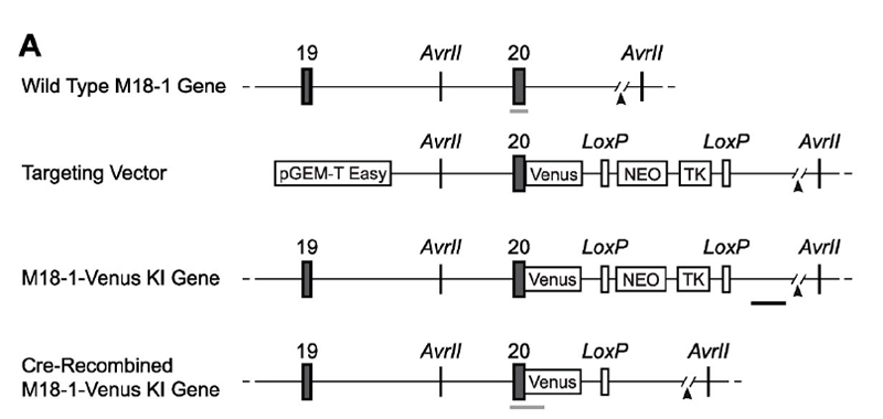 | Caption | Generation of the Stxbp1tm2.1Mver knock-in allele. Diagrams indicate wild-type Stxbp1 (M18-1) gene, targeting vector, M18V-neo-knock-in gene, and cre-recombined Stxbp1 (M18V) gene generating the Stxbp1tm2.1Mver allele. Exons are indicated by gray boxes and numbered. Black and gray horizontal bars indicate probes used for Southern blot analysis and PCR products used for genotyping, respectively. A 5-kbp section is not shown (arrowheads). LoxP, loxP sites; Venus, Venus cDNA; AvrII, restriction enzyme site; NEO, neomycin resistance gene; TK, thymidine kinase promoter; pGEM-T Easy, targeting vector. | ||||
