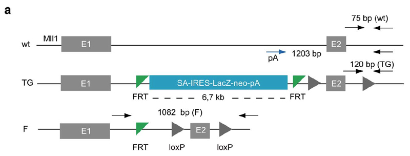 | Caption | Generation of the Kmt2atm1Afst allele. Complete recombination by Flpo but not Flpe of a targeted Kmt2a (Mll1) allele. (a) Scheme of the Kmt2a allele before and after Flp recombination. The LacZ cassette flanked by FRT sites is 6.7kb and was inserted in intron 1 of the Kmt2a locus by targeting. The arrows represent the PCR primers used for detecting recombination. Wild type (wt) and targeted (TG) alleles were distinguished using the PCR primers that flank the loxP site in the second intron. The presence of the LacZ cassette was detected using primers pA and the one 3' of the second intron loxP site. Flp recombination (F) was detected using the primer upstream of the 5' FRT site and the one 3' of the second intron loxP site. | ||||