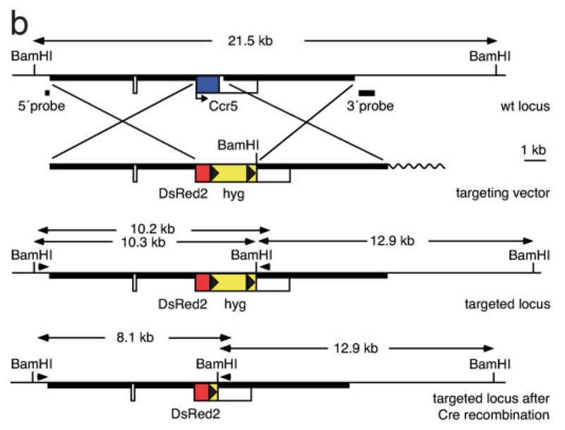 | Caption | Generation of the Ccr5tm2Blck allele. (b) Schematic representation of the targeting strategy used for the inactivation of the Ccr5 gene. The Ccr5 wild-type locus, the targeting vector and the targeted locus before and after Cre-mediated recombination are shown together with restriction sites relevant for Southern blot analysis. White boxes represent 5'- and 3'-untranslated regions, the blue box the coding region of the Ccr5 gene. Thick lines indicate homology arms, and the loxP-flanked hygromycin (hyg) selection cassette is depicted as a yellow box with black triangles at the ends symbolizing the loxP sites. The wavy line represents prokaryotic vector sequences in the targeting vector. The DsRed2 (red fluorescent protein) reporter gene at the targeted locus is shown as a red box. Sizes of the relevant restriction fragments or PCR products before and after homologous recombination and Cre-mediated deletion are shown. Arrowheads indicate the positions of primers used to demonstrate the deletion of the hygromycin cassette by long-range PCR. | ||||