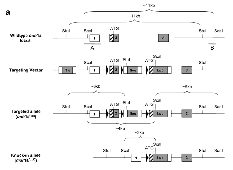 | Caption | Generation of the Abcb1atm1Kane (mdr1aflox) and Abcb1atm1.1Kane (mdr1aFLUC) alleles. (a) The map shows murine Abcb1a (mdr1a) exons 1 to 3 (boxes), respective introns (thin line), and upstream genomic sequences (thin line). Also shown are the targeting DNA construct, the targeted allele Abcb1atm1Kane (mdr1aflox), and the Cre-recombined knock-in allele Abcb1atm1.1Kane (mdr1aFLUC). Exons in white or a hatched pattern are nontranslated; exons in gray are translated, with the initiating ATG indicated. Black bars (A and B) indicate positions of Southern hybridization probes. Key restriction sites are also indicated. Neo: neo gene under the control of the PGK promoter, used as the positive selection marker. Luc: fLUC cDNA fused in-frame with the noncoding part (hatched) of Abcb1a exon 2. TK: HSV-thymidine kinase gene, used as the negative selection marker. Arrowheads: loxP sites, targets for Cre recombinase. | ||||||