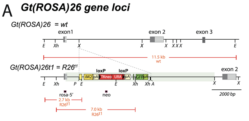 | Caption | Generation of the Gt(ROSA)26Sortm1.1(rtTA*M2,tetO-GFP)Rsp allele. The gene targeted R26t1delta allele controls the expression of DOX-inducible transcription from the endogenous promoter of the Gt(ROSA)26Sor locus. A) Gt(ROSA)26Sor and Gt(ROSA)26t1 (R26Rt1) loci. Exons are indicated as grey boxes; light grey show alternative spliced exons. Genetic elements inserted at the first XbaI site in intron1 of Gt(ROSA)26Sor are given in coloured boxes: first (yellow), the adenovirus major late splice acceptor sequence followed by the small intron of the adenoviral tripartite leader and the iM2 coding regionterminated by the human growth hormone polyadenylation signal (hgh_pA); second (red), a loxP site (black triangles) flanked neomycin/uracil selection cassette terminated by hgh_pA; third (green), the PtetO5-GFP gene module terminated by SV40_pA. Diagnostic restriction sites are indicated (E = EcoRV, Xh = XhoI, X = XbaI, P = PacI, A = AscI). The transparent green bar represents the chromosomal region covered by the targeting vector. Red-framed black boxes below R26Rt1 mark positions of Southern blot probes that detect restriction fragments given as red lines in kilo bases (kb). | ||||