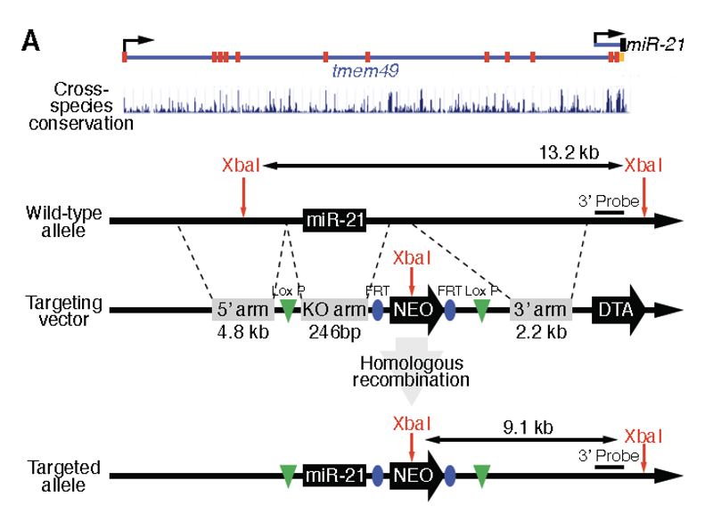 | Caption | Generation of the Mir21atm1Eno allele. A. Schematic representation of the mouse miR-21 (Mir21a) locus and targeting strategy. miR-21 is expressed as an overlapping transcript of TMEM49. The position of the 3' probe used for Southern blot is shown. Red boxes represent exons of the TMEM49 gene. DTA represents the selectable marker diptheria toxin A. | ||||