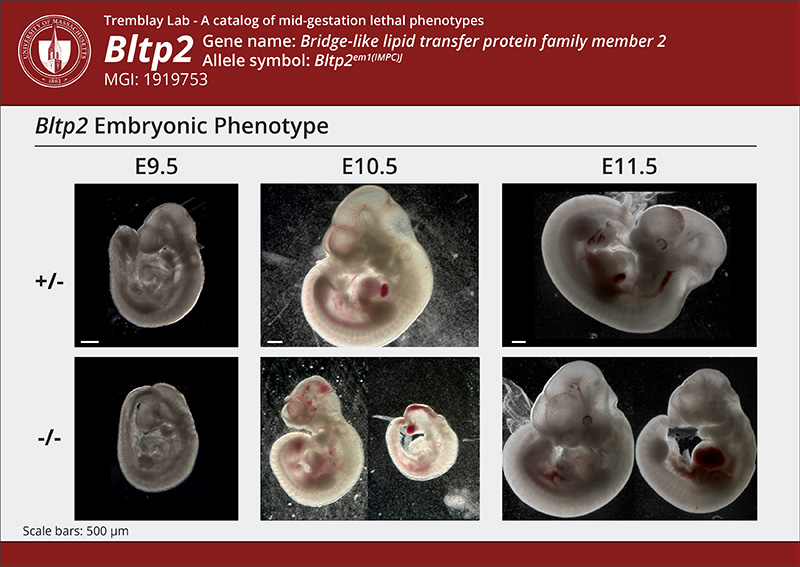 | Caption | Bltp2em1(IMPC)J/Bltp2em1(IMPC)J (Bltp2-/-) embryos are mainly normal at E9.5. By E10.5 a third of the mutants are resorbing/dying while those that are alive display a range of defects as depicted. A minority are less severe. At 10.5 most Bltp2-/- embryos that are alive have heart defects, half have abnormal head shape and some have abnormal blood pooling in the embryo. By E11.5 all recovered Bltp2 mutants are smaller than controls and while most are abnormal a few are surprisingly normal in appearance as the one on the left. | ||||