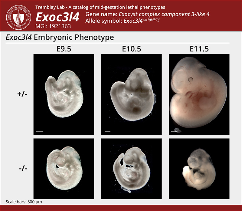 | Caption | Most E9.5 Exoc3l4em1(IMPC)J/Exoc3l4em1(IMPC)J (Exoc3l4-/-) embryos are normal as is the mutant shown above. By E10.5 most Exoc3l4-/- embryos are smaller than littermates but only a minority delayed. Almost half have abnormal hearts and some accompanied by pericardial edema, while others have cardiac edema. A minority display no gross defects. By E11.5 Exoc3l4-/- embryos are dying (such as the one displayed here) or undergoing resorption. | ||||