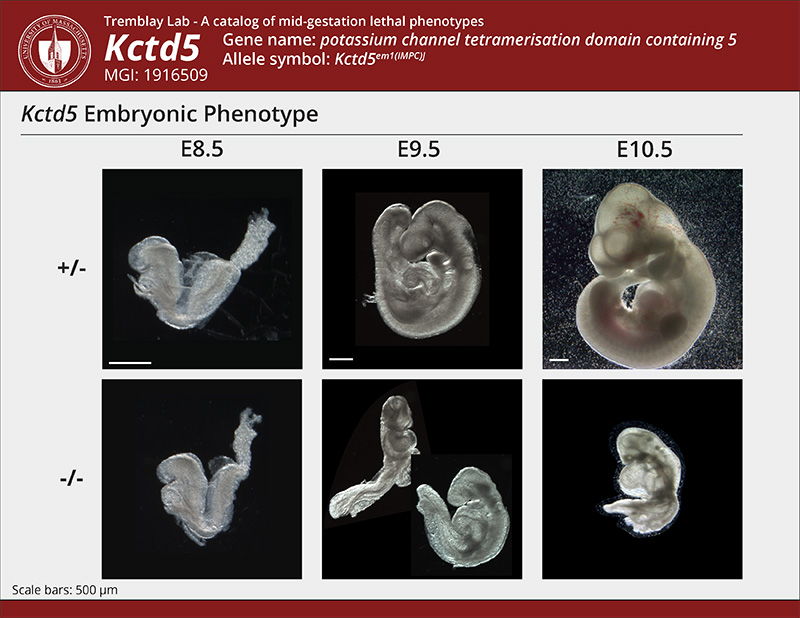 | Caption | At E8.5, Kctd5em1(IMPC)J/Kctd5em1(IMPC)J (Kctd5-/-) embryos are mainly normal. A minority display abnormal head shape, abnormal YS, abnormal heart or are delayed. By E9.5 Kctd5-/- embryos display slight epicardial edema, enlarged hearts and incomplete turning. Branchial arch defects are also noted in a majority, but likely related to the abnormal hearts. A minority of embryos display partially open posterior cranial neural tube and some have yolk sac vascularization defects. By E10.5 all Kctd5-/- are dying or resorbed with enlarged hearts. | ||||